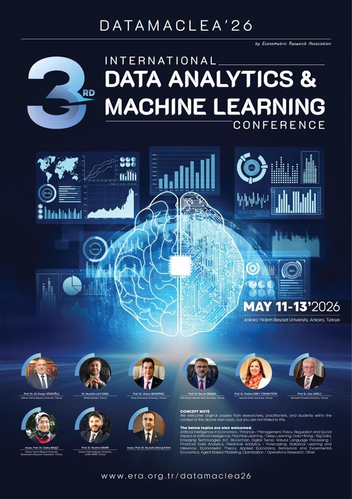 Ekonometri Araştırma Derneği (ERA) tarafından, Ankara Yıldırım Beyazıt Üniversitesi Uluslararası İlişkiler ve Stratejik Araştırmalar Enstitüsü (ULİSA) iş birliğiyle düzenlenecek olan 3. Uluslararası Veri Analitiği ve Makine Öğrenmesi Konferansı (DATAMACLEA’26), 11–13 Mayıs 2026 tarihlerinde Ankara’da (yüz yüze ve çevrim içi) gerçekleştirilecektir. Konferansın ana teması “Yapay Zekâ ve Ekonomik Verimlilik: Sektörel Uygulamalar ve Değer Yaratımı” olup; yapay zekânın ekonomi, finans, yönetim, veri analitiği ve ilgili alanlardaki uygulamalarına yönelik özgün akademik çalışmalar kabul edilmektedir.